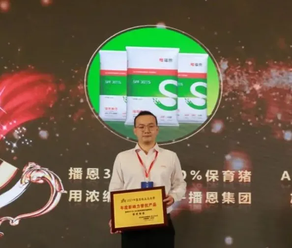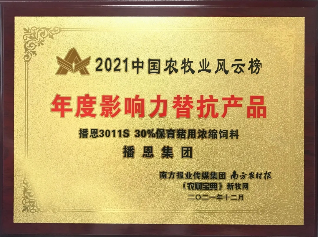 2021年12月11日,第11屆中國農(nóng)牧業(yè)風(fēng)云會、農(nóng)財(cái)寶典新牧網(wǎng)年會暨廣東省現(xiàn)代畜禽產(chǎn)業(yè)園研討會在廣州閉幕。在2021年中國農(nóng)牧業(yè)風(fēng)云榜頒獎會上,播恩集團(tuán)產(chǎn)品“播恩3011S 30%保育豬用濃縮飼料”榮獲“年度影響力替抗產(chǎn)品”獎項(xiàng),播恩集團(tuán)技術(shù)服務(wù)副總監(jiān)巴少波上臺領(lǐng)取獲獎牌匾。