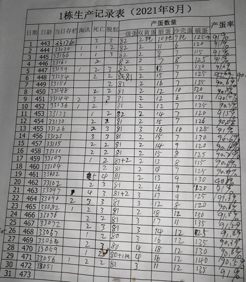 實(shí)際蛋雞生產(chǎn)中,20w蛋雞場(chǎng)都在用雜粕日糧,而生產(chǎn)水平也是相當(dāng)?shù)母撸?/span>470日齡產(chǎn)蛋率依然在91%以上。蛋重還能維持在47.0kg一箱(蛋重65克以上),見圖1。