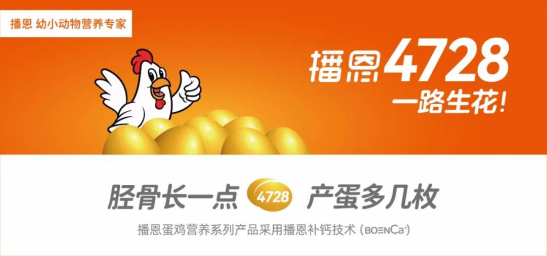 播恩4728,一路生花。為解決蛋雞養(yǎng)殖的營養(yǎng)痛點(diǎn),提供更專業(yè)細(xì)致的飼料營養(yǎng)呵護(hù),播恩對產(chǎn)品創(chuàng)新迭代升級,并全新推出4728蛋雞營養(yǎng)系列新品。該系列產(chǎn)品均采用播恩補(bǔ)鈣技術(shù),完美解決鈣消化、鈣吸收和鈣沉積三大命題,已申請專利保護(hù)。新品覆蓋了蛋雞育雛、育成、產(chǎn)蛋和淘雞4個(gè)時(shí)期的7個(gè)核心營養(yǎng)產(chǎn)品:開口料H000、育雛料H041、育成料H042、產(chǎn)蛋料H353/H033,伴產(chǎn)寶、伴殼寶、伴淘寶。具有更強(qiáng)的產(chǎn)品力及競爭優(yōu)勢,有效滿足專業(yè)化蛋雞養(yǎng)殖營養(yǎng)需求。