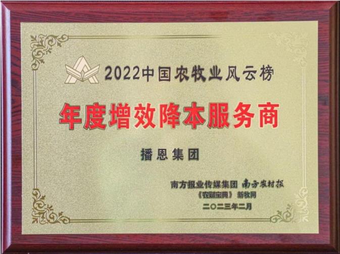 而作為一家專注創(chuàng)新的科技型企業(yè)集團,播恩以“降本增效”為核心關(guān)注點,從解決用戶迫切需求出發(fā),從管理、采購、生產(chǎn)、技術(shù)、服務(wù)等各個方面真抓實干,注重細節(jié)、創(chuàng)新與效率,為用戶提供了基于生物工程技術(shù)的降本增效解決方案。2023年2月21日,第十二屆中國農(nóng)牧業(yè)風(fēng)云會上,播恩集團榮獲“2022年度增效降本服務(wù)商”稱號。