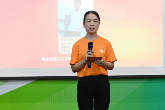 本次金榜題名頒獎典禮,還特別邀請到了劉越(福建農(nóng)林大學 碩士研究生)的家長——馬良贏(佛山工廠綜合部綜合員,2023最美播恩人)作為家長代表發(fā)言。她首先對集團一直以來提供的高水平員工福利表示衷心的感謝,從本次金榜題名活動中,她也感受到深深的員工關懷。她十分感謝集團提供了這樣一個和大家分享喜悅的機會,并表示以后會更加珍惜自己的工作崗位,努力做更優(yōu)秀的播恩人,努力培養(yǎng)孩子成長成材,最后祝集團發(fā)展越來越好,未來蒸蒸日上。