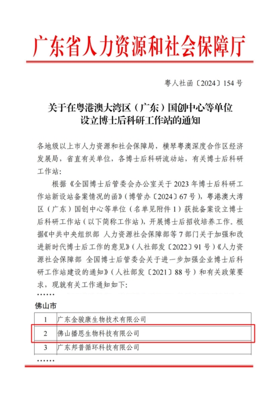 近日,廣東省人力資源和社會保障局印發(fā)了《關于在粵港澳大灣區(qū)(廣東)國創(chuàng)中心等單位設立博士后科研工作站的通知》粵人社函〔2024〕154號,佛山播恩生物科技有限公司成功獲批設立國家級博士后科研工作站。這一榮譽標志著佛山播恩在高層次人才培養(yǎng)、科研創(chuàng)新及產(chǎn)學研合作方面邁出了堅實的一步,為企業(yè)未來發(fā)展注入了強勁動力。