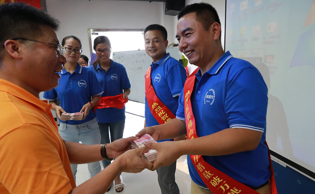 頒獎(jiǎng)儀式上,公司對(duì)達(dá)成本次萬噸目標(biāo)表現(xiàn)優(yōu)異的省區(qū)給予了相應(yīng)的表彰與獎(jiǎng)勵(lì)。隨后,曾紹鵬為獲獎(jiǎng)省區(qū)頒獎(jiǎng)。惠州省區(qū)、廣西大區(qū)、海南愛佑完成了月度銷量和總銷量兩項(xiàng)指標(biāo);肇慶省區(qū)、肇慶全價(jià)料、江門省區(qū)、粵西大區(qū)、梅州省區(qū)達(dá)成了月度目標(biāo)銷量,以上8個(gè)省區(qū)均獲得了現(xiàn)金重獎(jiǎng)。獲獎(jiǎng)代表們配上授帶,接過鮮花,展示著嶄新的一疊疊人民幣,整個(gè)會(huì)場充滿了歡呼聲與尖叫聲。
