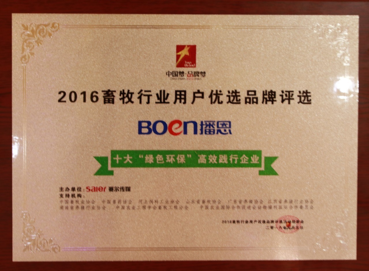 “沒有全民健康,就沒有全面小康”,2016年8月19至20日,全國(guó)衛(wèi)生與健康大會(huì)在北京舉行時(shí),習(xí)近平總書記強(qiáng)調(diào):要把人民健康放在優(yōu)先發(fā)展的戰(zhàn)略地位。其中講話中還涉及到“環(huán)境保護(hù)與食品安全”方面的重要內(nèi)容。2016“健康中國(guó)”戰(zhàn)略的確立,對(duì)于廣大畜牧業(yè)行業(yè)從事者以及企業(yè)提出了更高、更嚴(yán)格的要求,推動(dòng)健康養(yǎng)殖,保障食品安全我們責(zé)無旁貸,遵之則能得以更好的生存和發(fā)展。播恩集團(tuán)一路走來,追求創(chuàng)新、綠色、環(huán)保,深入貫徹落實(shí)國(guó)家相關(guān)行業(yè)政策,并關(guān)注市場(chǎng)需求,不斷調(diào)整優(yōu)化產(chǎn)品,走綠色可持續(xù)發(fā)展之路,此次榮獲“用戶優(yōu)選十大“綠色環(huán)?!备咝й`行企業(yè)”,和播恩集團(tuán)“用我們的產(chǎn)品和技術(shù),讓全球消費(fèi)者享用健康美味的農(nóng)產(chǎn)品”愿景不謀而合,嚴(yán)把從農(nóng)田到餐桌的每一道防線。